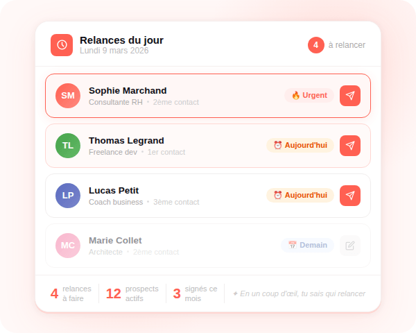 Chaque jour, Yupy t'affiche exactement qui relancer. Plus besoin de fouiller partout.