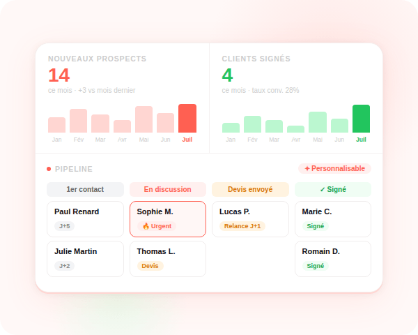 Visualise où en est chaque prospect d'un coup d'œil. Pas de CRM usine à gaz, juste l'essentiel.